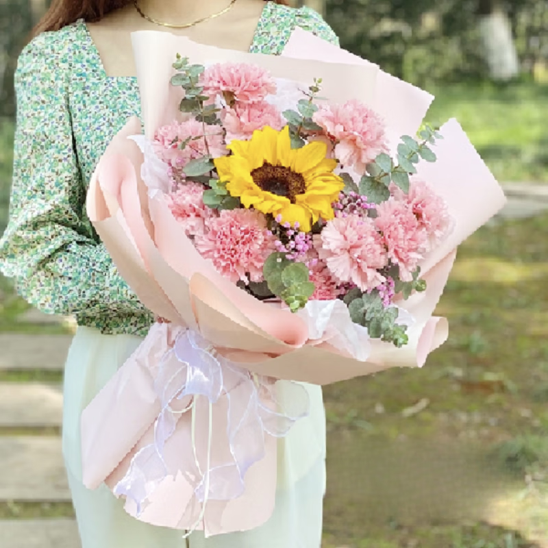 1支向日葵配3朵香槟玫瑰花束 按图包装款式做 |