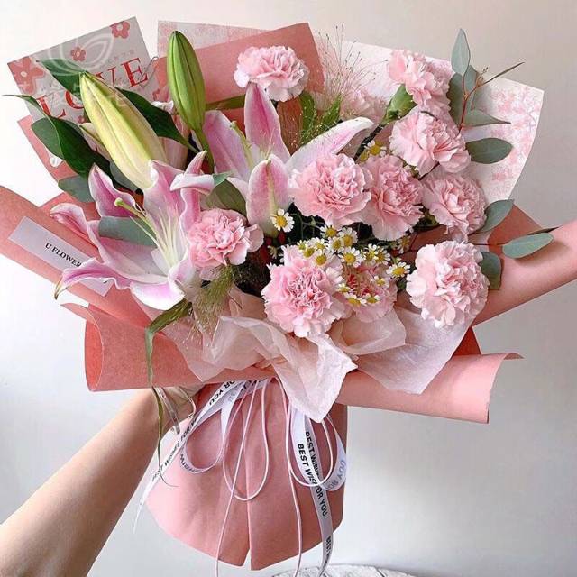 上海花千坊爱上海11枝粉色康乃馨搭配1枝粉百合花束 |