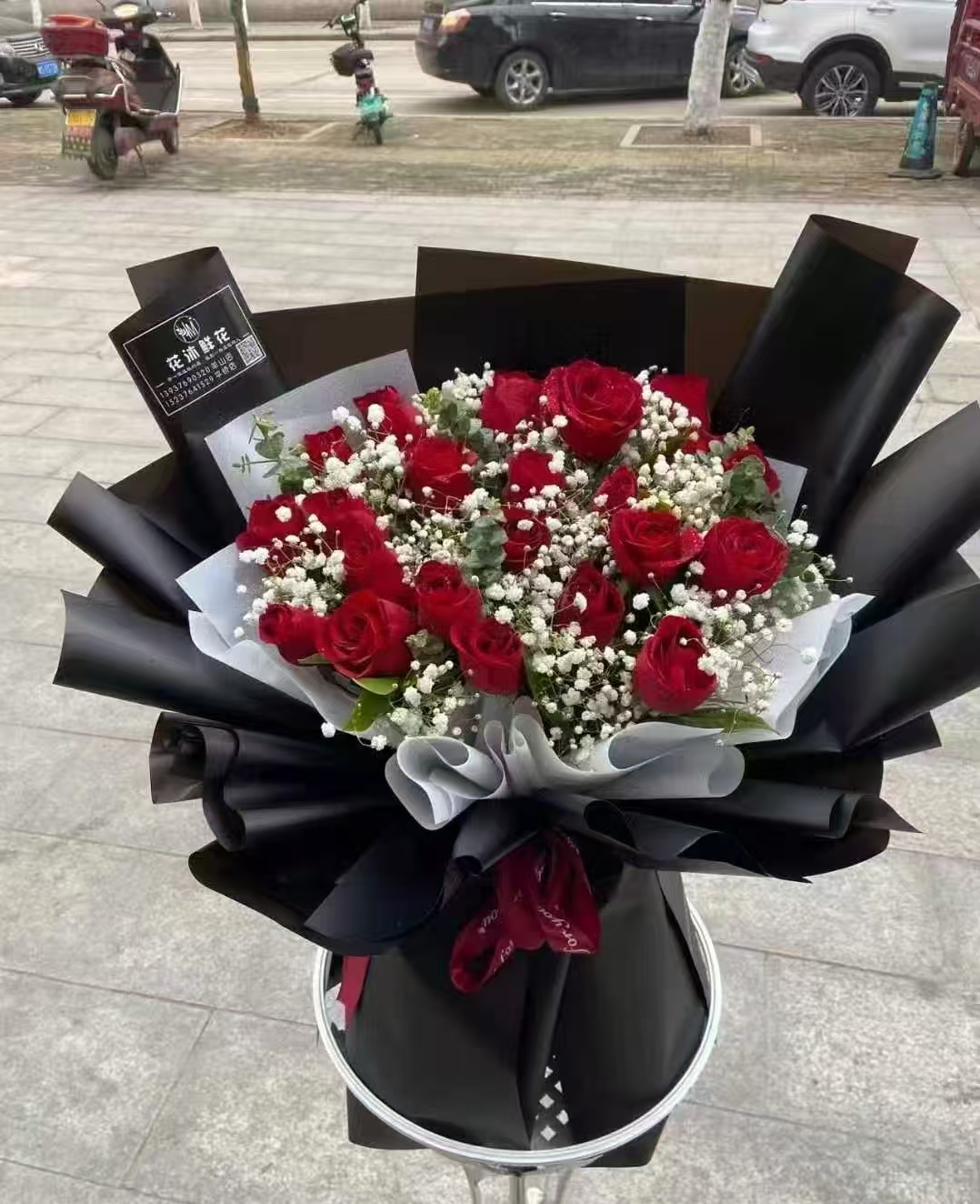 19朵红玫满天星尤加利叶如图 |