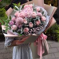 15粉玫混搭百合花束如图,(客人同意绣球乒乓菊换百合)有卡片 ,5点半前务必送到、否则下班了 |