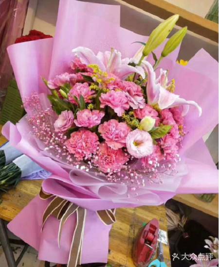 上海花千坊爱上海19支粉康乃馨5朵百合混搭花束,如图 |