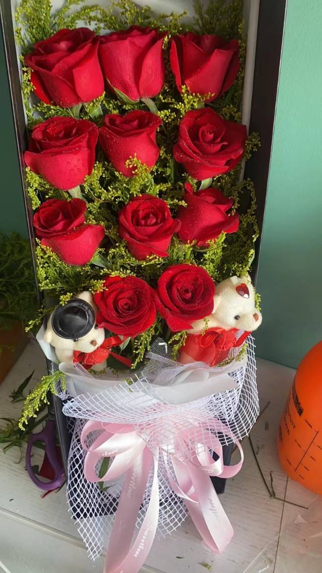 11朵粉玫瑰2朵向日葵混搭满天星花束 |