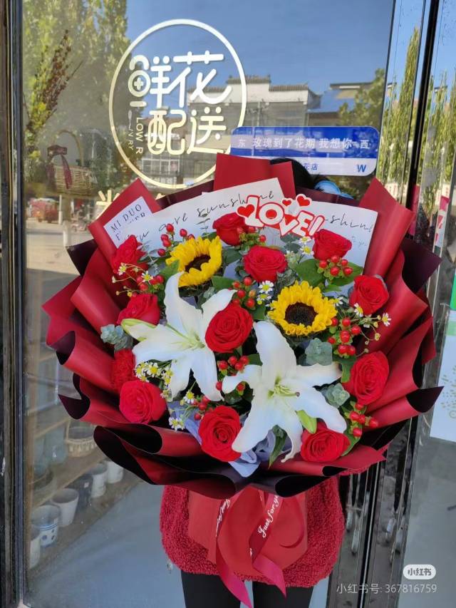 11支红玫瑰2支白百合2支向日葵花束,如图 |