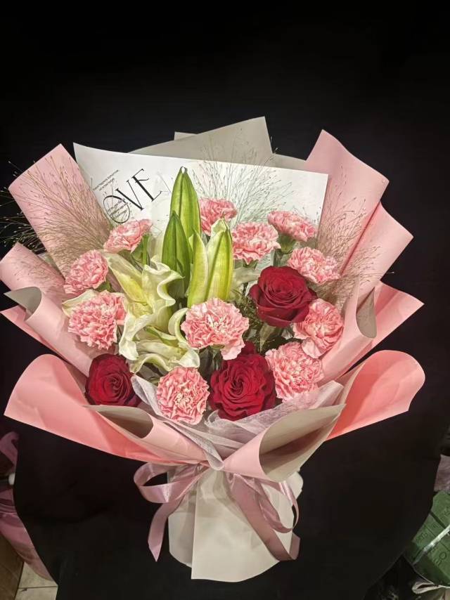 上海花千坊爱上海11支康乃馨3支红玫瑰1支百合花束 |
