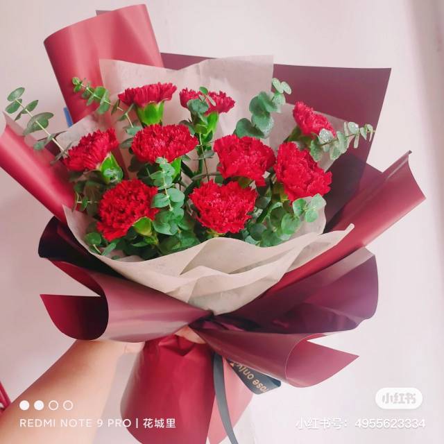 9朵红玫瑰6朵红康乃馨满天星混搭花束 按图红色包装 |
