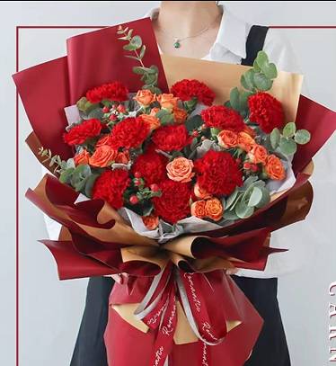 上海花千坊爱上海19枝红色康乃馨花束 (红色包装纸) |