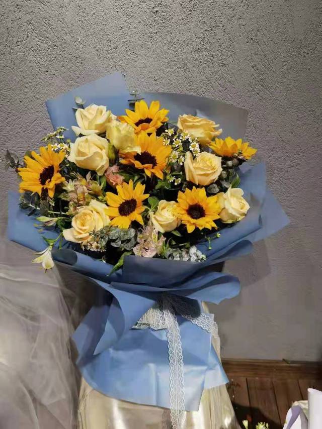 上海花千坊爱上海6朵向日加11朵香槟玫鲜花束,如图包。包装纸也用这个色的 |