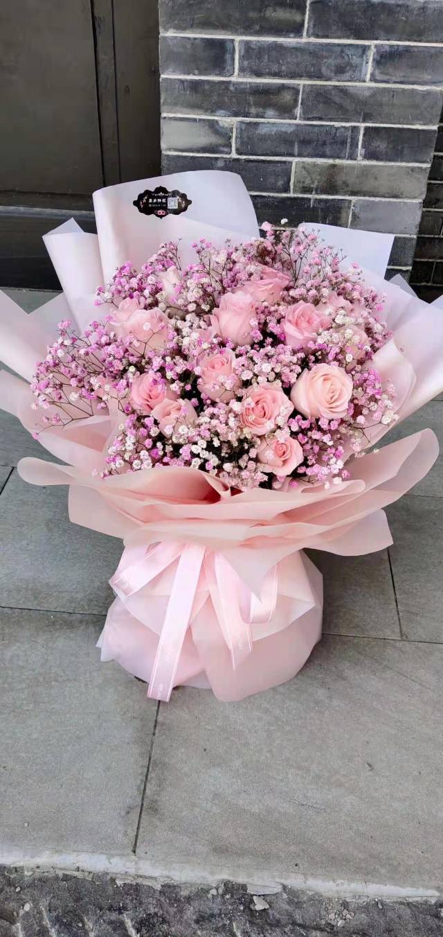 上海花千坊爱上海19朵粉玫瑰配粉星花束,如图
