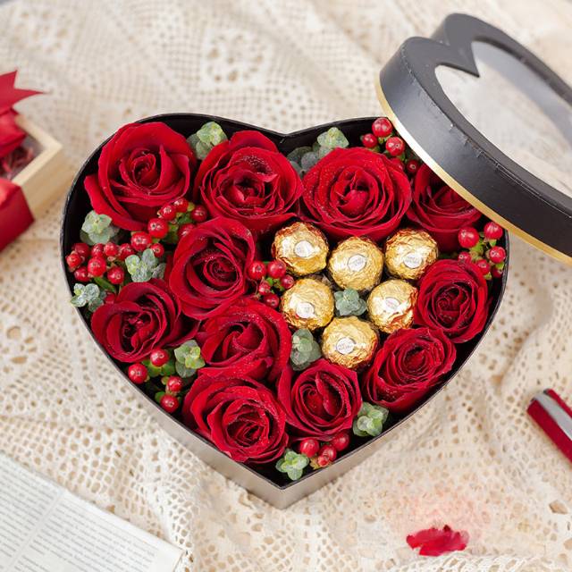 11朵红玫瑰花6颗巧克力礼盒心形花盒 按图 |