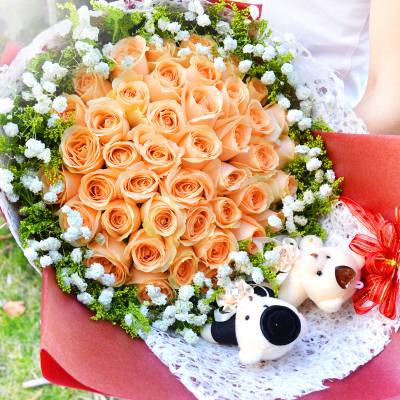 33朵香槟玫瑰+2小熊+黄英满天星搭配。红色外包装,白色内衬,按图制作,务必保证花材质量和新鲜,如图小姑 |