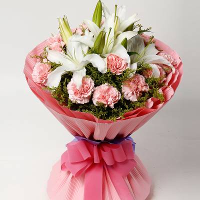 19朵粉康+6朵白百合花束,搭配黄英,粉色包装,如图制作 |