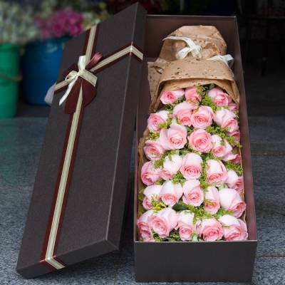 33朵粉玫瑰礼盒。搭配黄英,如图制作。包好看些 |