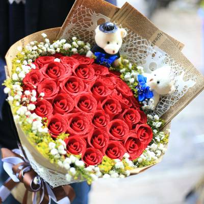 上海花千坊爱上海(注意:里面的玫瑰用粉色和红色混搭)33朵混搭玫瑰花束+2小熊。搭配黄英,满天星 |