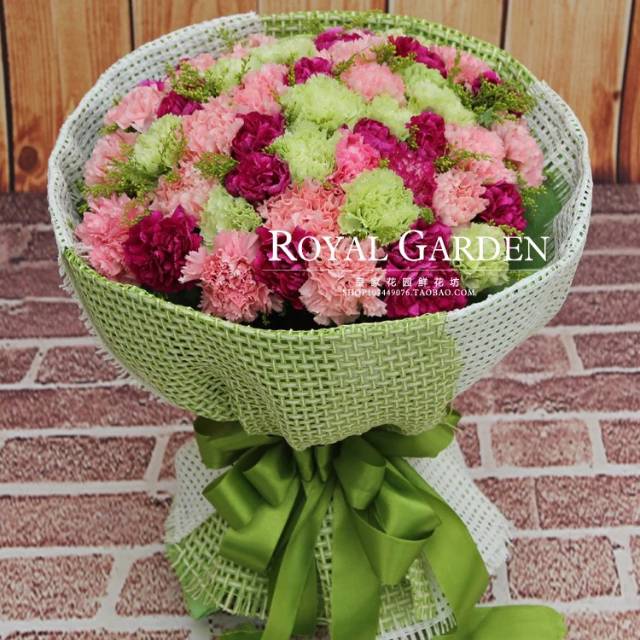 上海花千坊爱上海33朵混搭玫瑰+33朵康乃馨,搭配石竹梅。请花艺师帮搭配康乃馨颜色。包好看些。(花朵和包装,丝带都不要出现黄色和白色)制作好回图 |