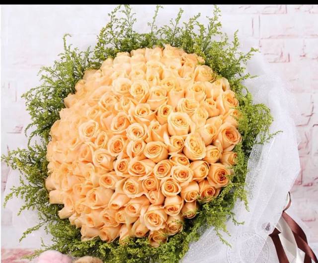 上海花千坊爱上海99朵香槟花束,白纱包装,搭配黄英,满天星,制作好回图 |