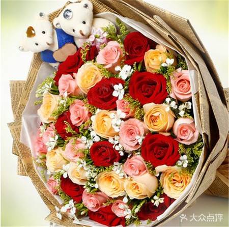 上海花千坊爱上海33朵混搭花束英文报纸包装,如图 |