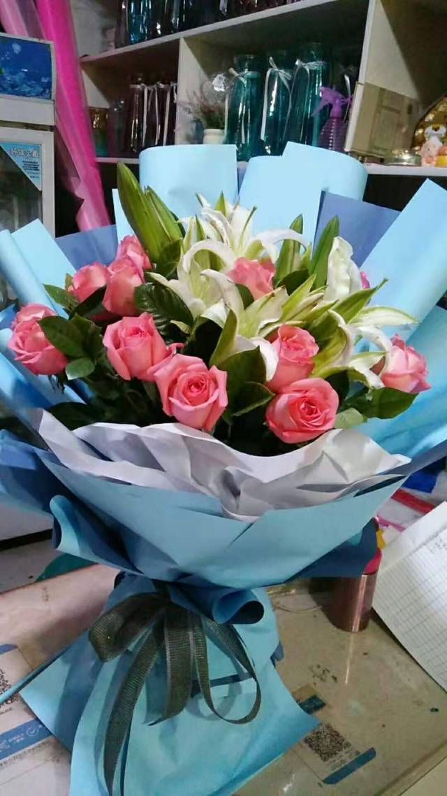 11朵粉玫加1支多头白百合鲜花束。如图包 |