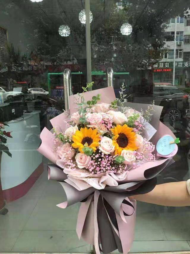 上海花千坊爱上海11朵代安娜粉玫加2朵向日花束,如图包 |