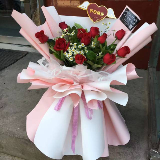 11朵粉玫瑰2向日葵满天星混搭花束,另加一支红玫单支的另外包下 |