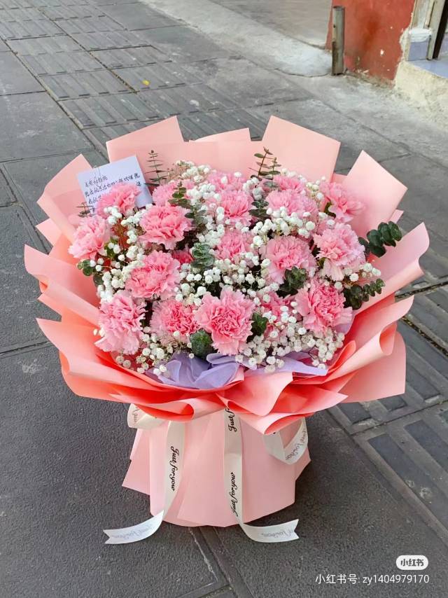 上海花千坊爱上海19支粉康乃馨配白满天星花束,如图 |