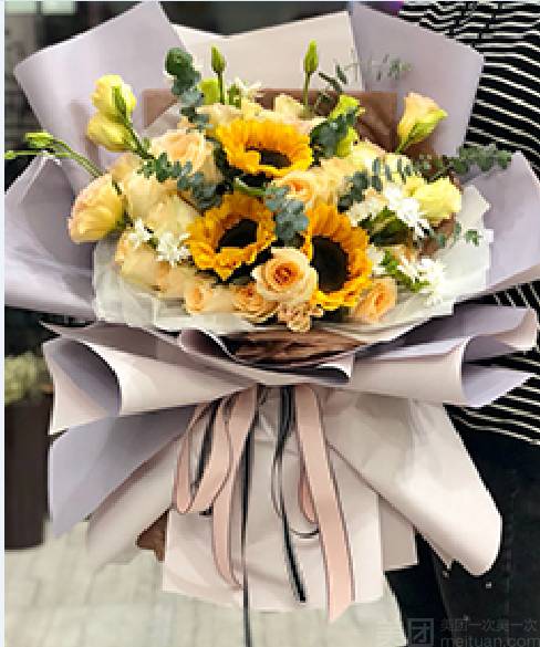 16朵香槟玫瑰3朵向日葵梗桔 |