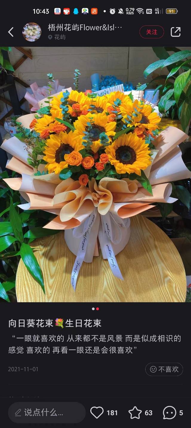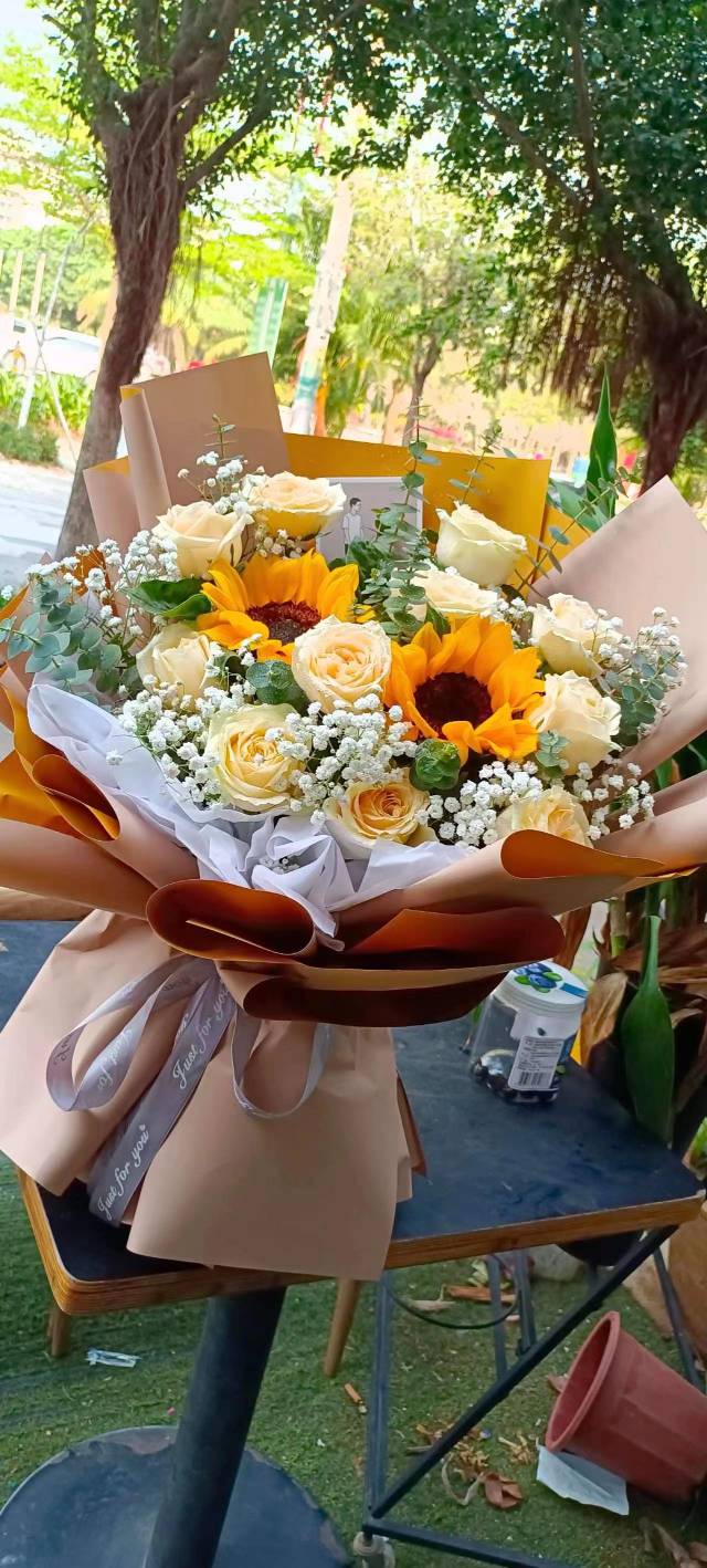 上海花千坊爱上海19朵香槟玫瑰2朵向日葵花束。如图包 |