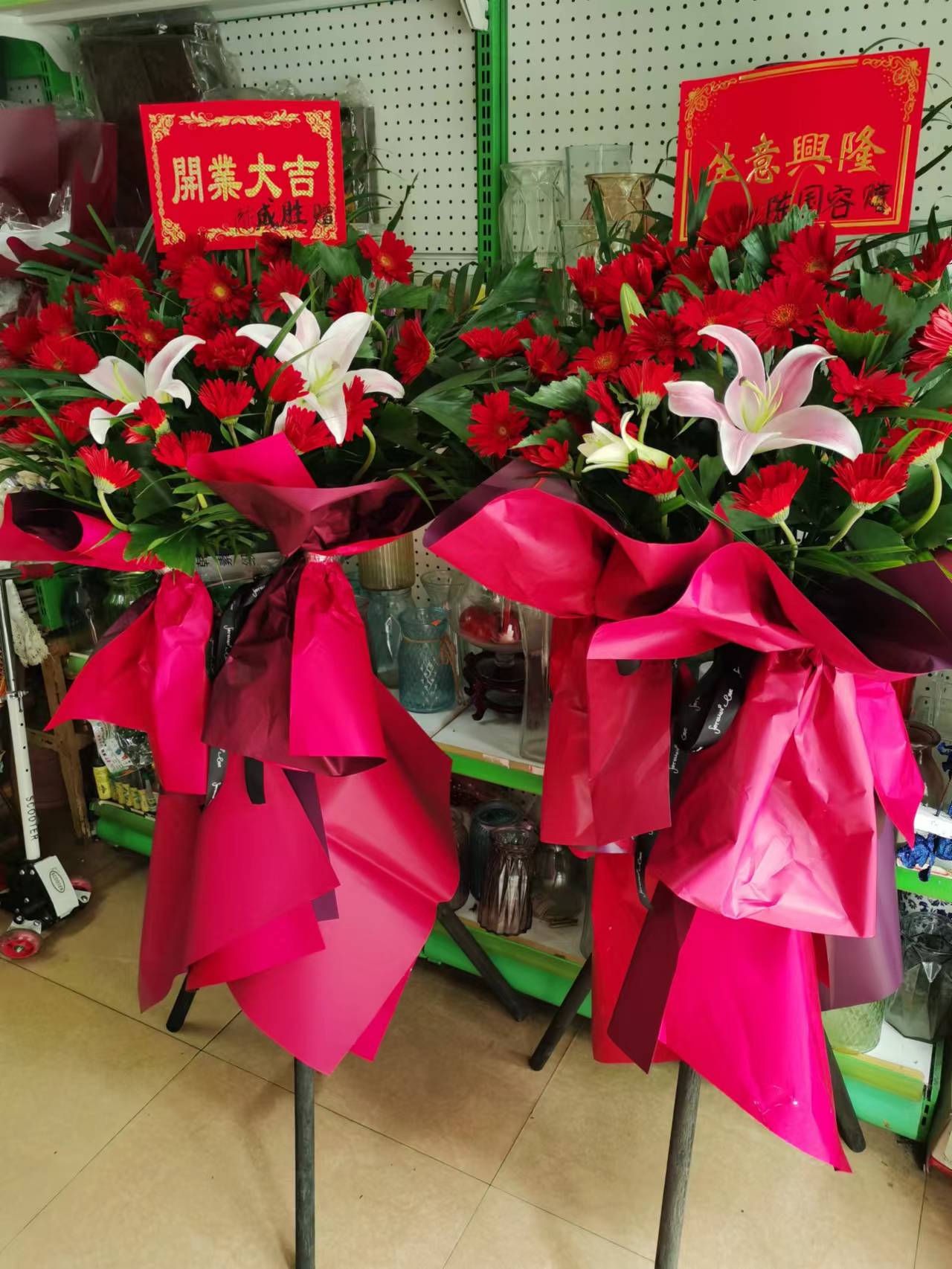 一束是:8朵向日鲜花束, 加一束是:33朵红康加一支多头粉百合花束。 |
