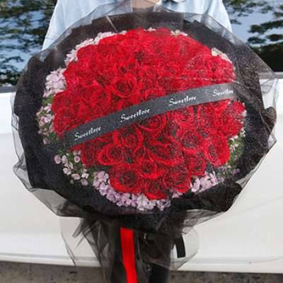 上海花千坊爱上海52朵红玫四周围粉色相思梅黑纱包装如图,花要新鲜 |