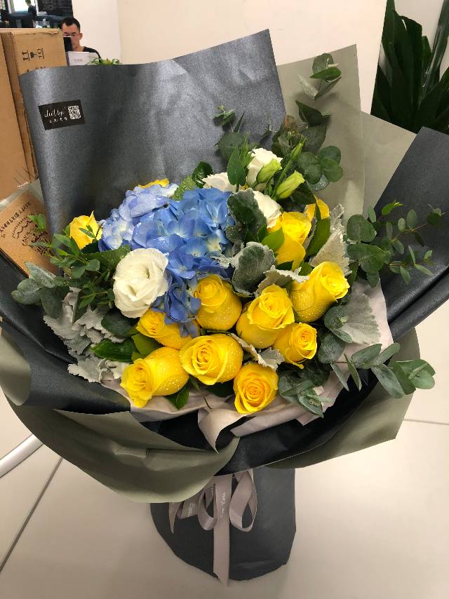 15支黄玫瑰蓝绣球桔梗尤伽俐银叶菊混搭花束,如图制作 |