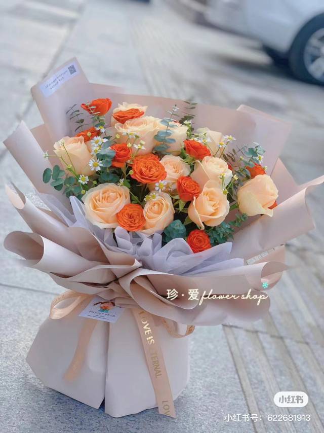 香槟玫瑰11枝,向日葵2枝,绿色桔梗5枝,绿色小菊3枝,叶上花3枝,按图包 |