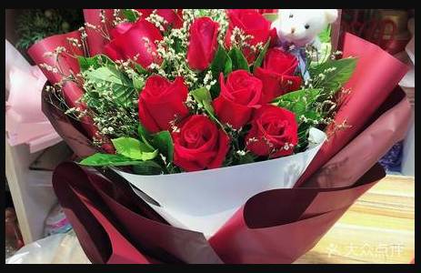 上海花千坊爱上海11朵红玫瑰花束加一个熊花束,如图,下午5点半送到,做好马上 送。谢谢 |