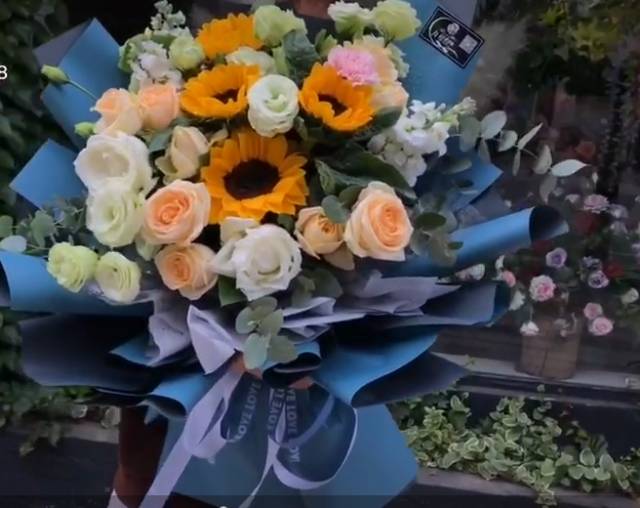 4朵向日葵7朵香槟玫瑰洋桔梗混搭花束(18朵主花材),如图包装大气好看,有卡片 ,按时送达(送到前台说说名字就行,人不在就让人代收,12月24日早上9点前送到凤尾竹前台。) |