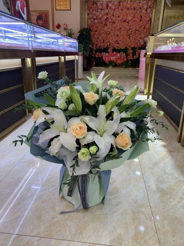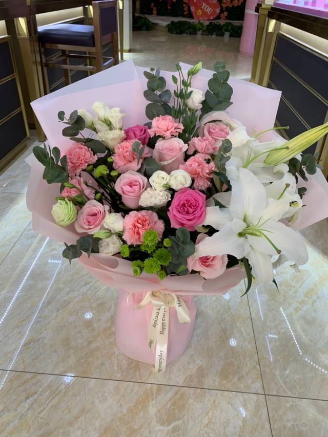上海花千坊爱上海百合三头的2支+粉玫13+粉康6+加緑雏菊2支+洋桔梗4支花束如图,有卡片 ,做好马上送。 |