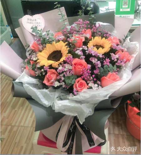 上海花千坊爱上海11朵粉玫瑰两朵向日葵混搭花束 |