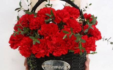 33朵红色康乃馨手提花篮,花材新鲜,包装好看,有卡片,如图 |