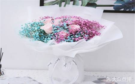 上海花千坊爱上海6朵粉玫瑰蓝粉满天星混搭花束,如图