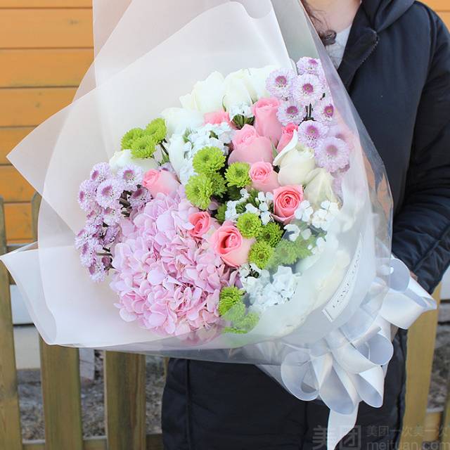 上海花千坊爱上海10朵粉玫瑰10朵白玫瑰 粉绣球混搭花束,如图