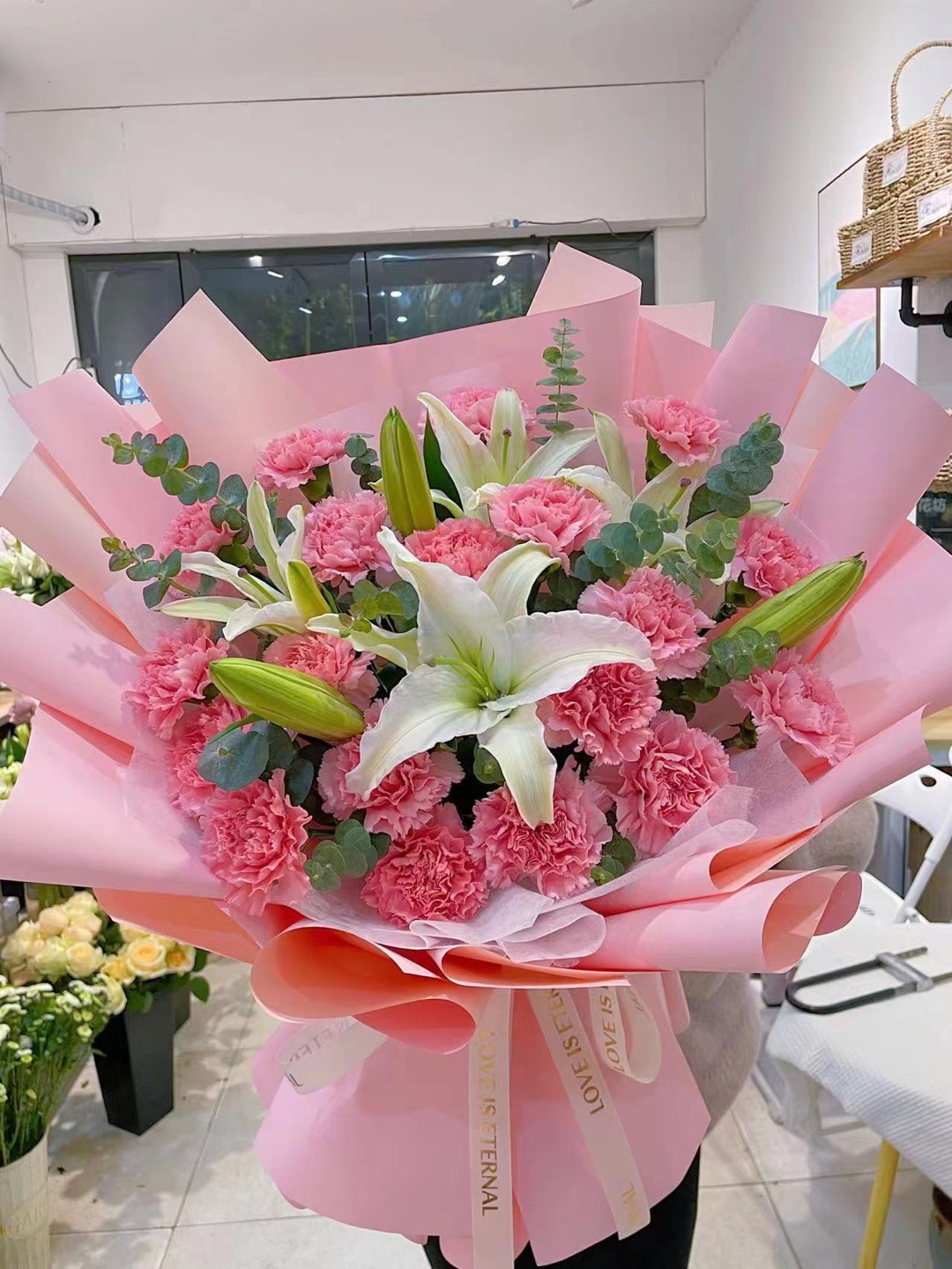 11枝粉色康乃馨搭配1枝粉百合花束 按图 |